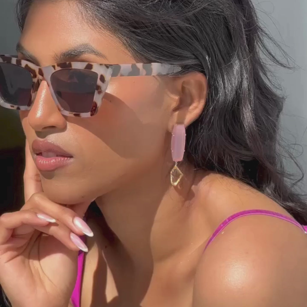 Solar Dust burns with heat and attitude. This gorgeous drop earring set features faceted citrine blazing against dusty pink chalcedony and rose-gold detailing - hand-set, hard-won luxury. Think sun on metal and the glow after a long night